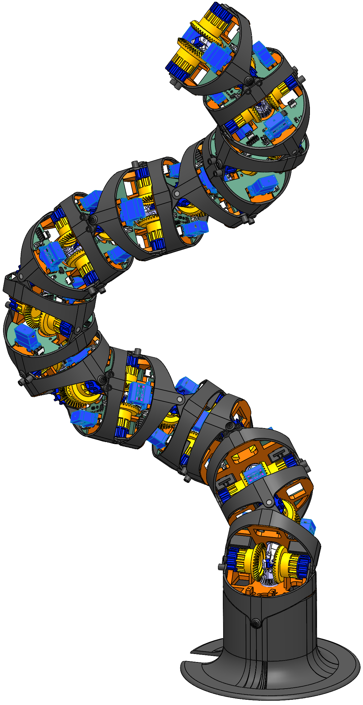 We describe the mechanical and electrical design, actuation principle, and locking architecture, and derive a kinematic model specialized to the alternating joint geometry. Workspace characteristics are analyzed through forward-kinematics sampling, highlighting geometric asymmetries introduced by joint orientation. The actuation constraint imposed by shared drive magnitude is formalized using a lock-state vector representation, revealing that arbitrary joint configurations must be executed as sequences of motion segments separated by discrete lock transitions. The influence of drive stop count on execution smoothness is demonstrated. We demonstrate the motion and torque output capabilities of our design experimentally using an assembled five-module mounted chain. These results establish a foundation for scalable, modular design and kinematic control of single drive actuator hyper-redundant manipulators.